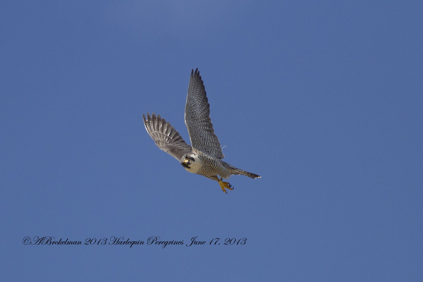 One of the fledged peregrines Kimani flew but came right to the ground. The Canadian Peregrine Foundation had to put her back on the ledge. The parents went nuts when he went on the nest building. Enjoy the flight shots.