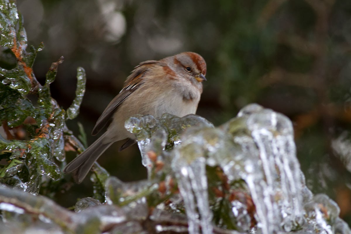 This sparrow got stuck on the ice. I watched him for over an hour then walked out to the tree and he flapped his wings but didn't move. I went back into the garage and got the broom stick as he was high in the tree. I gently tapped the bottom of the ice branch and pieces of ice broke away and away he flew. I hope he was ok.